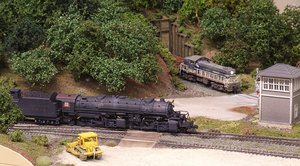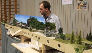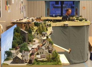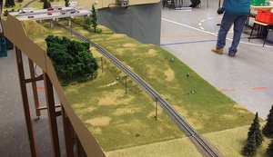 Wie so oft, kam auch bei uns das Beste am Schluss, in diesem Fall am Ende des Arrangements: Oliver hatte in einigen Nachtschichten seine Betriebsstelle Fremont Branch rechtzeitig für die Ausstellung durchgestaltet. Doch damit nicht genug. Auch ein kleiner Schattenbahnhof, der sich hinter dem Tunnel der eigentlichen "Hauptstrecke" verbirgt, wurde noch rechtzeitig fertiggestellt, so dass auf der Zweigstrecke neben den Lokalgüter- und Kohlezügen für Fremont weitere Züge verkehren konnten.