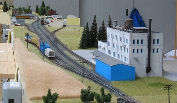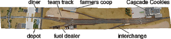 Das Gleisbild ergab sich aus folgenden Überlegungen: Ein local fährt auf die siding ein, womit diese weitgehend blockiert ist. Es sollten also keine großen Anschließer von der siding abzweigen sondern vom Hauptgleis. Das schräge Halbreliefgebäude von Farmers Coop war schon vorhanden und muss von Osten her angefahren werden. Bei Cascades Cookies war die Zufahrt wegen des Schuppens über der Zuckerentladung nur von Westen her möglich. Gleichzeitig erzwang die Größe des Fabrikgebäudes ein Verschwenken der kompletten Gleislage zur Modulvorderkante. Um eine unschöne S-Kurve in der östlichen Einfahrt zu vermeiden, wählte ich den trapezförmigen Grundriss für die beiden Hauptsegmente. Durch die „gesetzten“ Gebäude ergab sich die Lage des Freiladegleises von selbst: es konnte nur noch parallel zum Hauptgleis vor Farmers Coop verlaufen.
