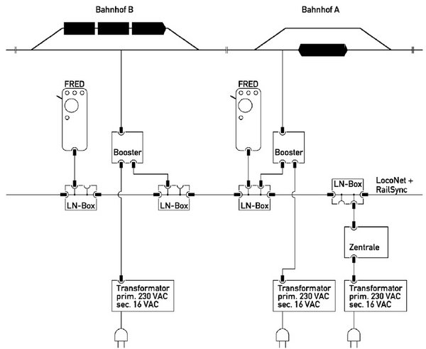 Die LN-Boxen haben neben ihrer Funktion als Kabelverbinder vor allem die Aufgabe als Einsteckmöglichkeit für die Handregler zu fungieren. Die LN-Boxen werden deshalb zirka alle 5 Meter an der freien Strecke und in ausreichender Zahl an den Betriebsstellen montiert, damit die dort arbeitenden Lokführer stets eine freie Einsteckmöglichkeit für ihren Handregler in der Nähe des Geschehens finden. Beson-dere Bedeutung hat dies, wo feinfühlig rangiert werden muss, wie zum Beispiel beim Ankuppeln von Wagen mit Originalkupplung. Für die LN-Boxen gibt es immer wieder Sammelbestellungen und für die rationelle Bearbeitung der Gehäuse gibt es immer wieder Stanzaktionen am Rande von FREMO-Treffen. Fertige Abzweigdosen (Y-Verbinder) sind ebenfalls in FREMOdulen zu finden, hier gibt es allerdings immer wieder Probleme mit der Qualität, die schon zu entsprechenden Betriebsstörungen bei Treffen geführt haben.