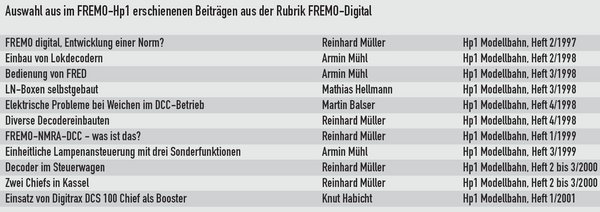 Dies war ein kurzer Überblick über FREMO-Digital. Wer neu zum FREMO kommt, der tut wie in allen anderen Bereichen gut daran, sich beim Besuch des nächsten Treffens bei einem der 'älteren Hasen' Schlau zu machen. So können Erfahrungen ausgetauscht und die erforderlichen Kontakte geknüpft werden, die erforderlich sind, um an die nötigen Informationen heranzukommen. Außerdem kann man so mit den FREMOikanern aus der näheren Umgebung in Verbindung kommen und vielleicht gleich von den nächsten DCC-Bastelaktionen in der Nähe erfahren. Eine weitere Informationsquelle ist das Internet: Auf der FREMO-Homepage ist viel über FREMO-Digital zu erfahren. Außerdem gibt es für Diskussionen zum Thema die Mailingliste FREMODCC. Ich finde den Weg über persönliche Kontakte allerdings interessanter und im Zweifelsfall auch effektiver
