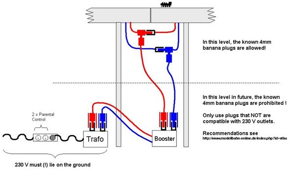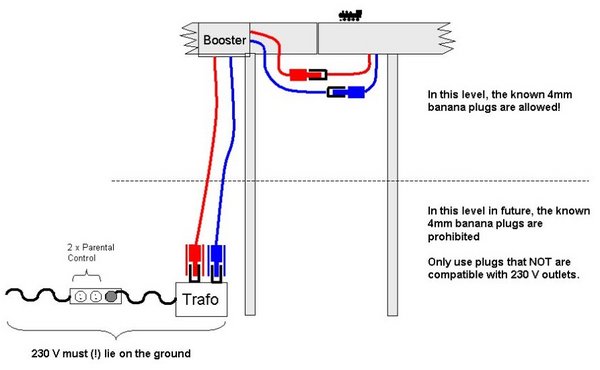 - Cable connections between the Transformer <--> Booster <--> Track must be designed so that no connection between 230 V electrical outlets and the track can be made.