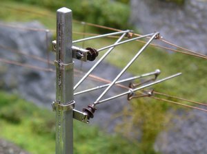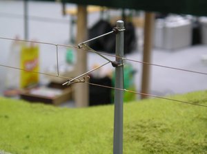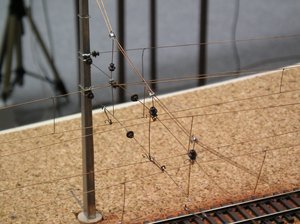Der Aufbau und spätere Abbau der Module mit Fahrleitung im Strecken- / Bahnhofsbereich bereitete keine Schwierigkeiten. Das Verbinden bzw. Trennen der Fahrleitung (0,3mm Bronzedraht) zwischen den Modulübergängen wurde meines Erachtens technisch sehr gut gelöst, wie sich bei dem durchgeführten Betrieb während des Treffens herausstellte. Kein Verhaken zwischen Stromabnehmer und Fahrleitung. Von der Optik und von der Betriebszuverlässigkeit bietet sich der 0,3mm Bronzedraht als optimales Material an. Das zeigte sich sowohl im Bahnhofsbereich mit Quertragwerken als auch im Streckenbereich, wo bis auf einige Komponenten wie z.B. Masten, Seitenhalter, Isolatoren von Sommerfeldt alles in Eigenfertigung entstand. Die notwendige Abspannung des Fahrdrahtes und Tragseil erfolgt über Radspannwerke, bei denen Bleigewichte den Fahrdraht auf richtige Spannung halten, was im Fahrbetrieb sehr wichtig ist. Um einen guten optischen Eindruck des Fahrleitungsbetriebs zu erreichen, ist die Modifizierung der Stromabnehmer unerlässlich. Mechanische Leichtgängigkeit des Stromabnehmers ist hier gefordert, um ihn mit einer sehr geringen Kraft an den Fahrdraht zu bringen. Bei den eingesetzten E-Loks / E-Triebwagen war die Leichtgängigkeit so gut, dass der Stromabnehmer mit einem kurzen Luftstoß niedergedrückt werden konnte.