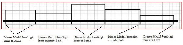 Jedes Modul (mit allen seinen Segmenten) ist mit soviel Beinen auszustatten, dass es alleine stehen kann. Wobei es durchaus sein kann, dass ein oder auch zwei Modulbeine nicht benötigt werden, wenn ein breiteres Modul beim Arrangement-Aufbau an ein schmaleres angebaut wird.