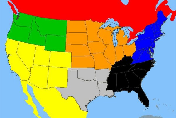 “Leere“ Wagen sollen nach Erfüllung ihres fingierten Frachtauftrages vorbildgemäß wieder in ihre Heimatregion zurückgefahren werden. Das sind in der Regel bei unseren Arrangements bestimmte (Schatten-) Bahnhöfe, denen, je nach geografischer Lage, bestimmte Farben zugeordnet sind. Die Farben zur Kennzeichnung dieser Heimat-Region der Güterwagen auf den CarCards entnehmen wir aus folgender Darstellung der USA Karte.