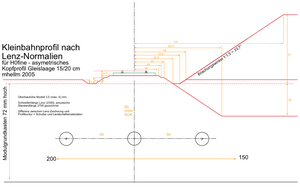 Das Kopfprofil der Module ist daher nur 35 cm breit und 7,2 cm hoch (bei Verwendung von 12 mm starkem Material, bevorzugt Birken-Multiplex), durch die außermittige Gleislage ist eine gefällige Gestaltung möglich. Eine Länge von 90 cm ist ideal für den Transport im PKW.