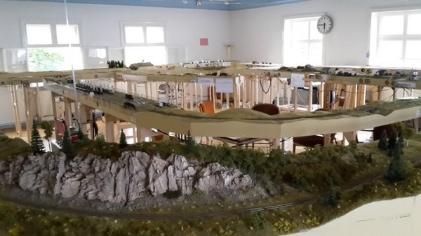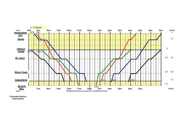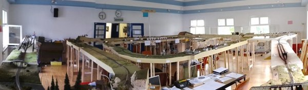 Trotzdem konnten nicht alle angemeldeten Module mit eingeplant worden. Es bewies sich abermals, dass beim Erreichen der Grenzen in zwei Dimensionen in die dritte Dimension ausgewichen werden musste, sprich, wir alle werden die häufig notwendigen "Duck-unders" noch ein paar Tage im Rücken und Knien fühlen dürfen. Gefahren wurde auf einem Layout mit drei Schattenbahnhöfen und zum ersten Mal und im Testbetrieb mit dabei die weitläufige Station Cimarron, mit gut 6 Metern Gesamtlänge die größte Betriebsstelle.