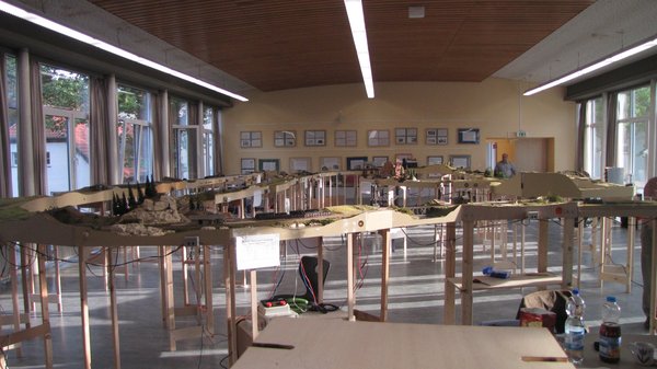 Es wurde in "Akkordarbeit" das Arrangement nebst DCC und Telefon am Freitag innerhalb von nur knapp 4 Stunden aufgebaut. Die Aufstellung des Rollmaterials in Grundstellung, als auch das Briefing konnten noch durchgeführt werden. Am Samstag konnten insgesamt 5 Sessions und am Sonntag noch eine Session gefahren werden. Auf die siebte Session (den Sonntag im Session-Wochenplan) haben wir verzichtet.