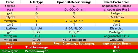 Um schnell einen zur Fracht passenden Wagen zu finden und die Karten besser ihrem Wagen zuordnen zu können, wurde die Papierfarbe der Karte bestimmten Güterwagengattungen zugeordnet (Tabelle 1). Zur Erstellung von Wagenkarten hat Andreas Nothaft ein immer wieder verbessertes Hilfsmittel in Form einer MS-Excel-Datei kreiert, das den FREMO-Mitgliedern zur Verfügung steht (inzwischen gibt es dazu auch weitere Lösungen).