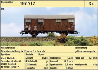 Die Wagenkarte ist das "Ausweispapier" für jedes beim FREMO auf Schienen rollende Gefährt. Entsprechend dieser Aufgabe sollte sie gewissen- und dauerhaft gefertigt sein. Das unveränderliche Merkmal ist die Wagennummer, die deutlich sichtbar oben links ihren Platz auf der Karte einnimmt.
