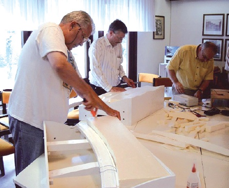 Damit die offenen Stellen im Modul sich jetzt in Richtung blühende Landschaften verändern können, brauchen wir eine Methode, um das Gelände zu formen. Auch hier gibt es verschiedene Methoden. Im FREMO hat sich inzwischen der Bau mit Polystyrol-Hartschaumplatten durchgesetzt. Inzwischen haben jeder besser sortierte Baumaterialienhändler und auch viele Baumärkte diese Platten, die es in verschiedenen Stärken gibt, in ihrem Programm. Die Platten sind leicht, einfach zu bearbeiten und haben trotzdem eine große Steifigkeit. Mit Bastelmesser, Raspel und grobem Schmirgelpapier werden die Platten modelliert und anschließend mit Montagekitt (Aufgepasst! Manche greifen die Polystyrol- Hartschaumplatten an.) oder wasserfestem Holzleim in die Modulkästen geklebt. Ein Überstrich mit braungrüner Abtönfarbe gibt dem Modul seine Grundform.
