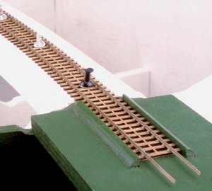 Das Gleise verlegen wird für viele der Anfang der richtigen Modellbahntätigkeiten bei dieser Modulbauaktion sein. Ab jetzt haben wir die Möglichkeit, ab und zu unsere schönste Lok mit den schönsten Wagen auf das Modul zu stellen. Das sieht doch viel besser aus als in der Verpackung. Aber bitte langsam: denn auch beim Verlegen der Gleise kann man einige Fehler machen. Bevor die Gleise auf dem Modul verlegt werden, schrauben wir von oben genau an der Stelle, wo die Schienenprofile später liegen, in die Endprofile zwei kleine Messingschrauben. Sie werden mit einer Laubsäge bis auf die Höhe abgesägt, wo die Schienenunterkante anfängt.