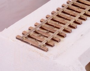 Ich verklebe die Gleise grundsätzlich mit Zweikomponentenkleber oder wasserfestem Weißleim. Wenn man wasserlöslichen Kleber verwendet, besteht die Möglichkeit, dass die Gleise sich beim Schottern wieder lösen. Während des Abbindens werden die Gleise von Stecknadeln gehalten. Als Nächstes werden die Messingschrauben mit einem großen Lötkolben (75 Watt) mit den Schienenprofilen verlötet. Dies gewährleistet eine dauerhafte Verbindung und sorgt dafür, dass die Gleise zukünftig nicht so anfällig für Transportschäden sind. Dann werden die Schienenprofile so gekürzt, dass sie exakt bündig mit dem Ende des Moduls abschließen. Wenn sie zu lang sind, besteht die Gefahr, dass sie einen Transportschäden abbekommen. Wenn sie zu kurz werden, gibt es nach dem Zusammenschrauben der Module einen unschönen Übergang.