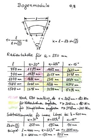 Wie man die Geometrie eines Moduls (Außenlänge, Bogenradius, Winkel) berechnet, zeigt das nebenstehende Bild. Ich habe mich dazu entschieden, ein Bogenmodul von rund einem Meter Außenlänge mit einem Winkel von 22,5 Grad bei einem Bogenradius von 232 cm zu bauen. Dies entspricht beim Vorbild in etwa dem Mindestradius auf der Nebenbahn.