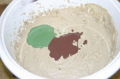 Bei der Farbgebung ist natürlich der eigenen Kreativität ein gewisser Freiraum gegeben. Am Ende sollte aber Braunton bei Untergründen für anschließende Begrasung herauskommen. Das ergibt sich bei etwa 32 g grüner Farbe und ca. 70 g brauner Farbe.