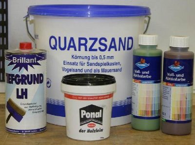 Quarzsand gibt es ebenso, wie den Holzleim, den Tiefengrund und die Abtönfarbe in jedem Baumarkt zu kaufen.
