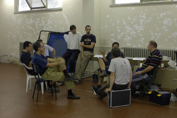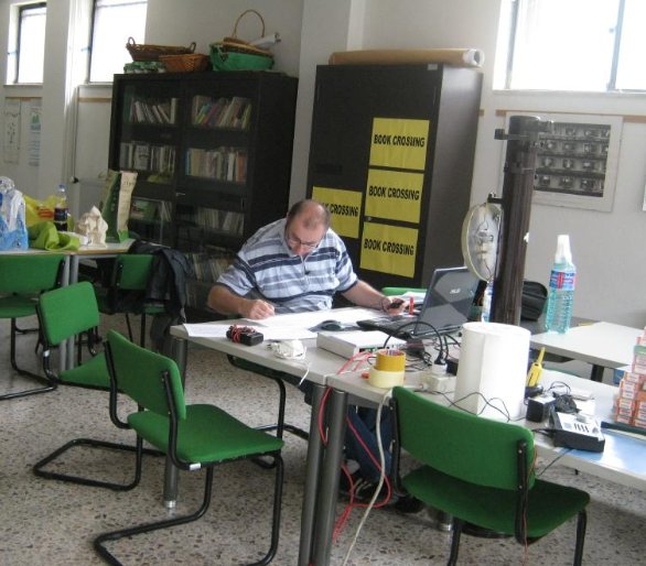 I macchinisti conducono i treni, aiutati dai capitreno se alla sessione partecipa un numero di persone adeguato: i due si dividono i compiti di comunicazione e gestione delle stazioni durante gli incroci; i dirigenti locali (DL) sono responsabili della gestione della propria stazione della quale, in collaborazione con il Dirigente Unico, decidono i movimenti dei treni (ingresso, uscita, incroci, ecc.). Il Dirigente Unico (DU), che quando possibile collochiamo in una stanza separata (Fig. 12) simulando la realtà, ha il compito, gravoso, del controllo del traffico sull’intera linea concedendo i nulla osta al movimento dei treni, modificando anche, se necessario, l’orario. Abbiamo adottato un regolamento del traffico cui fare riferimento durante la sessione d’esercizio. Le comunicazioni, che nella realtà su una linea come la nostra avvenivano per mezzo telefono, vengono tenute via radio (ogni macchinista, il DL ed il DU) secondo regole codificate.