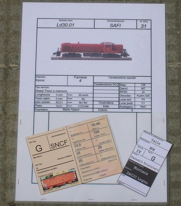 Ogni carro utilizzato dispone necessariamente di una carta che ne descrive le caratteristiche salienti; utilizziamo anche le carte loco che descrivono le caratteristiche delle loco (tra cui l’indirizzo DCC) come base per la carta treno (documentazione di marcia) che, per un treno merci, è in realtà composta dalla carta loco che contiene le carte carro che contengono gli ordini di carico (carte di carico). Per i treni passeggeri invece la carta treno è composta dalla carta loco più una carta che riassume le fermate del treno stesso secondo la successione in linea.