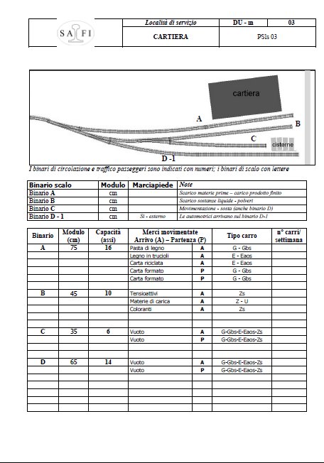Ogni stazione del nostro layout genera un traffico passeggeri e merci (magazzino merci, piani di carico, ecc.) ed ogni insediamento produttivo abbisogna di “materie prime” per produrre merci. Occorre stabilire questo fabbisogno di (passeggeri e) merci in termini di carri (quanti carri carichi e di cosa, altrettanti vuoti in arrivo o di rimando) in un determinato periodo (per es. settimana e quindi giorno per giorno).