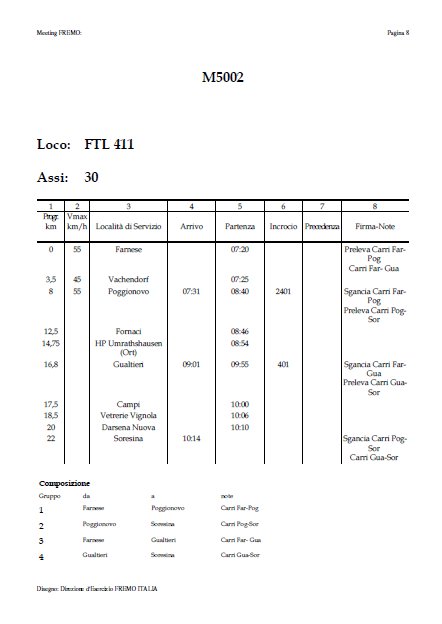 Ogni loco è necessariamente dotata di carta loco (con l’informazione fondamentale dell’indirizzo DCC, ovvero quale numero selezionare sul controller portatile, un fred, utilizzato per la guida). Questa carta dispone di una tasca in cui alloggiare le carte carro con le carte di carico quando si tratta di un merci, cui si aggiunge un orario tabellare dove, per ogni treno, sono indicati gli orari di arrivo /partenza per ogni stazione ed eventuali azioni/manovre, che si tratti di un treno passeggeri o di un merci, a realizzare di fatto una carta treno (Fig. 9), di grande ausilio al lavoro di ogni macchinista.