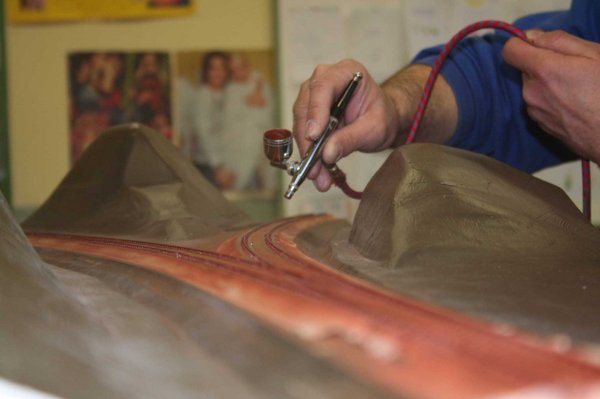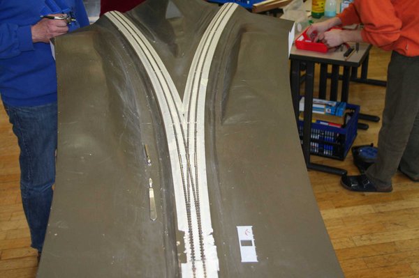 Das Gleis ist soweit abgeklebt,dass die Schienen Rostbraun lackiert werden können. (Foto: Reinhard Düpmeier)