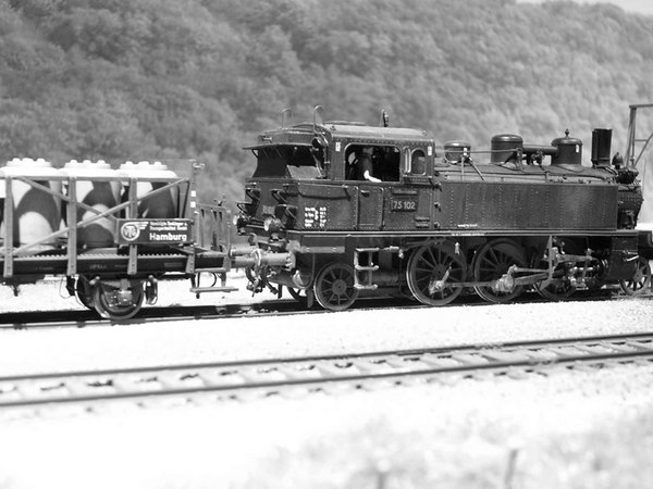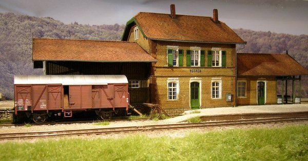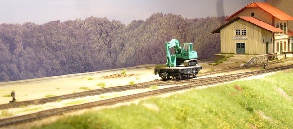 Die beiden ortsgestellten und mit Schlüsseln gesicherten Weichen 3 und 4 (190 1:9 und 190 1:7,5) sind ein Selbstbau auf der Basis von Pertinax-Schwellenrosten und Kleineisen aus dem BahnSinnShop®. Das Gebäude wurde nach Originalplänen mittels Lasertechnik erstellt. Der Ladekran stammt aus Peters Pappkiste. Weiteres Zubehör kommt aus den Programmen von Petau, Weinert, NMW, Mininatur und Kotol.