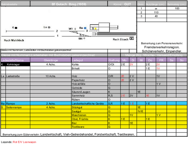 Der 1901 erbaute Bahnhof Gutach (Breisgau) liegt an der eingleisigen Nebenbahn von Freiburg (Brsg) nach Elzach (km 10,2). Die Initiative zum Bau ging von der Firma Gütermann aus, welche schon damals eine elektrische Werksbahn (750 mm Lenz) in Betrieb hatte. Diese Werksbahn wurde dann an den Bahnhof angeschlossen. Der Güterverkehr war deshalb schon immer vom Frachtaufkommen dieser Firma geprägt. Auch der Landhandel Raiffeisen e.G. und weitere ortsansässige Firmen erhielten und versandten ihre Waren mit der Bahn.
