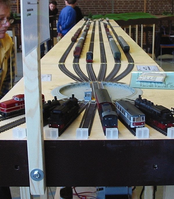 Die 7 handgestellten Weichen (190 1:9 und 210 1:4,8) sind von Modellwerk und die Weichenstellhebel von Weimann. Das Gleis ist von Tillig-Teichmann - die Drehscheibe von Roco. Der kleinste Radius beträgt 140 m (Zufahrt Drehscheibe). Eine RUT-Box ist montiert.