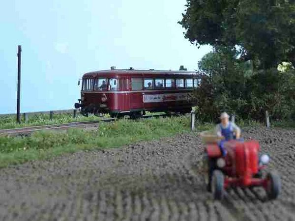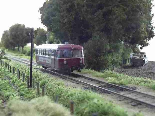 Ein typischer Triebwagen unter der Holzbrücke am Hp Henstedt-Wohld. Die Brücke besteht aus echtem Holz!