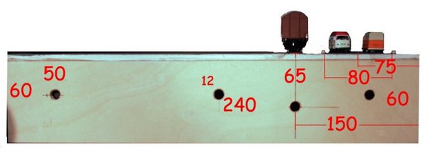 Die Modulverschraubungen ergeben sich aus der „FREMO-Zentralschraube“: mittig unter dem Gleis, 65mm von der Schwellenunterkannte. Diese Bohrung ermöglicht das Verbinden mit allen anderen FREMO H0-RE-Modulen, auch ohne Profilwechselmodule. Die weiteren Bohrungen liegen 60mm von der Profilaussenkante entfernt, dadurch ist auch in den Ecken genug Platz für Versteifungen vorhanden. Eine weitere Bohrung 240mm von der Gleisseitigen Modulkante ermöglicht es, auch schmalere Module sicher zu verbinden, die mindestens 300mm breit sind.