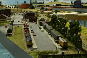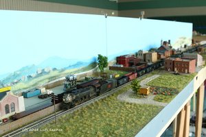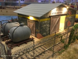 Sweetwater - eine vielseitige Betriebsstelle! Das Industriegebiet ist über eine Rampe erreichbar und liegt eine Ebene tiefer als der eigentliche Bahnhof. Es gibt Übergabegleise und genügend Möglichkeiten nach Herzenslust zu rangieren. Das wurde auch fröhlich ausgenutzt, es gab genügend Frachten zuzustellen und abzuholen. Die Junction bietet weitere Betriebsmöglichkeiten an und die Hintergründe waren zauberhaft schön gemalt (nix Photoshop - Pinsel und zwar vom feinsten!)