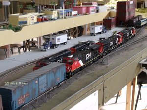 Aber keine Angst, wir hatten auch noch anderes im Programm. Hier steuert Jörg einen langen mixed Freight durch St. Michele mit 5 GP30 der GM&O. Hardy hat den Centerbeams am Zuganfang wunderschöne Holzladungen gebaut - schade daß das auf dem Bild nicht so richtig rauskommt - aber wir wissen es halt ...