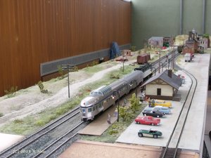 Die Stuttgart Model Railroaders kamen mit 6 Leuten um mit uns zu spielen und brachten ihre Betriebsstelle "Golden" mit. Fantastisch - sie haben (mal so eben für unser Treffen) das Ganze noch mal schnell um 2,40m verlängert. Das kam richtig gut an, jetzt konnten hier auch etwas längere Züge bequem kreuzen!