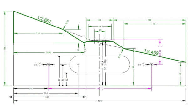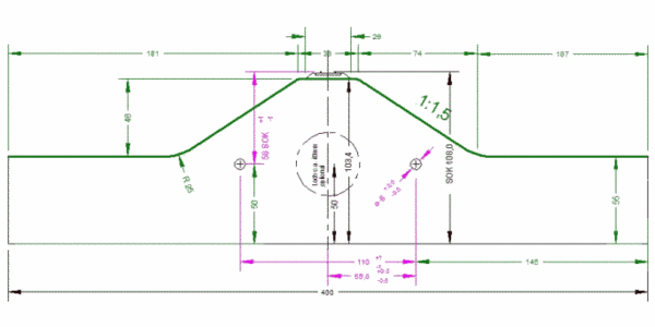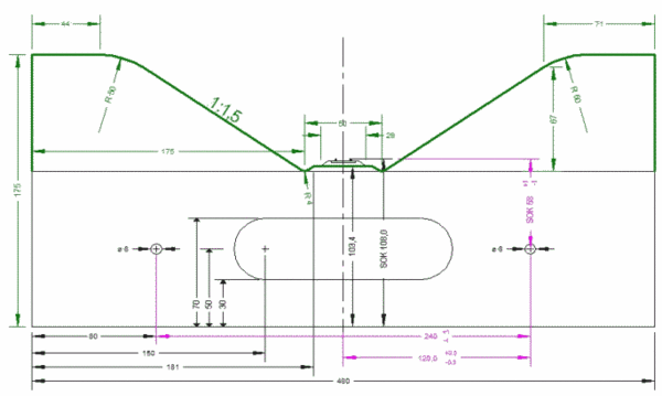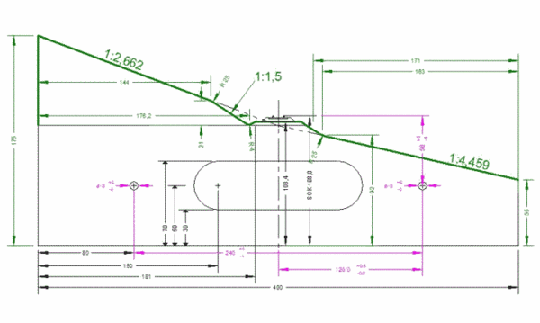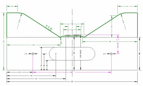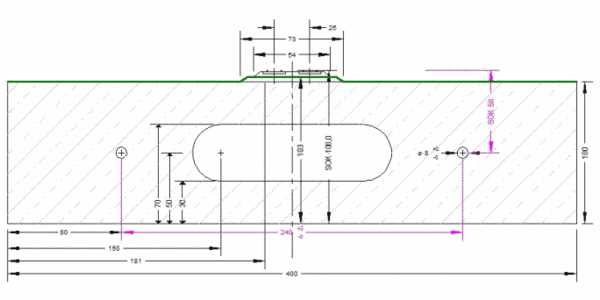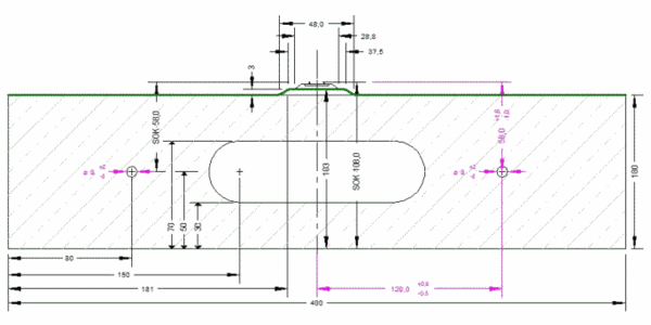 - Zur Verbindung der Module untereinander dienen 2 Löcher mit Durchmesser 8 (-0/+2) mm; sie liegen 58 mm unterhalb SOK, 120 mm rechts und links der Gleismitte.