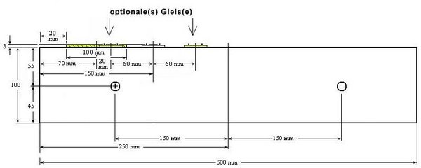 Zusätzliche optionale Gleise sind mit einem Gleismittenabstand von 60mm rechts oder links des Hauptgleises zu legen.