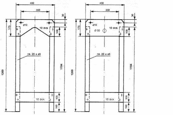 Alle Module mit einer Länge von über 50 cm benötigen einen Modulfuß. Ein Modulfuß besteht aus 2 Holzleisten, die durch 400 mm breite Sperrholzbretter oben und unten miteinander verbundenen sind. Das obere Sperrholzbrett ragt 75 mm über die senkrechten Leisten hinaus und hat die gleichen Bohrungen wie das Endprofil. Die Module werden so mit den Endprofilen auf die Stirnseiten der senkrechten Leisten gestellt, dass sich je 2 Module und ein Modulfuß verschrauben lassen. Das untere Sperrholzbrett dient als Versteifung. Die Modulfüße können ohne Höhenverstellung hergestellt werden.