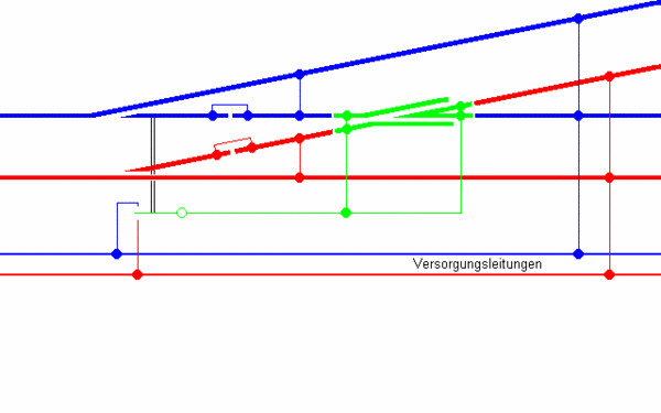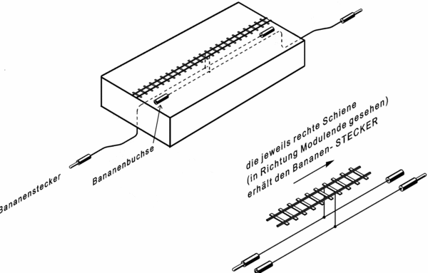 Es wird das sogenannte Hetero-System verwendet . Unter jedem Modul innerhalb des Modulkastens sind zwei durchgehende Leitungen mit einem Querschnitt von mindestens 1,5 mm˛ für die Stromversorgung der Gleise zu verlegen, mit denen sie am besten mehrfach zu verbinden sind. Dabei endet nur das jeweilige linke Kabel (vom Modul weg zeigend) in einer Buchse. Das rechte Kabel ist 50 cm länger und endet direkt in einem Stecker.