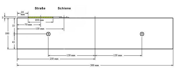 Für das Thema Industriegebiet wird ein asymmetrisches Profil verwendet. Dadurch wird mehr Platz für die detaillierte Gestaltung gewonnen. Die Gleismitte liegt 150mm, die Straßenmitte in einem Abstand von 70mm von der vorderen Modulkante.