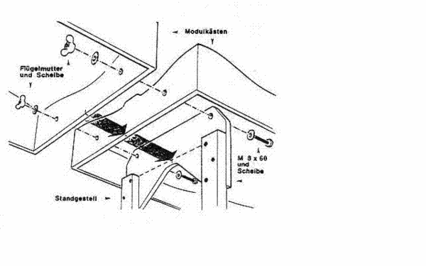 Module werden mit Flügelschrauben M8x60, Flügelmuttern M8 und entsprechenden Unterlagscheiben (Bauscheiben!), Stärke 1mm, miteinander verbunden.