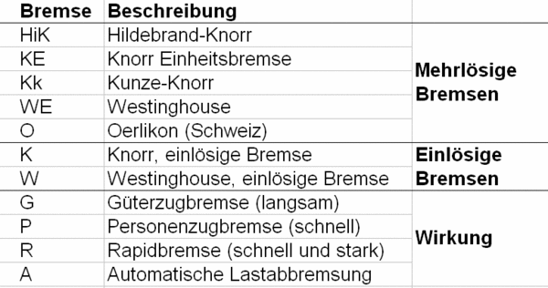 Im Arbeitsblatt Bremsen sind die verschiedenen Bremsarten und Wirkungen abgelegt. Hieraus werden die Informationen für die Kommentare des Feldes Bremse im Wagenkartenarbeitsblatt generiert.