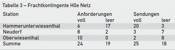 Der Treffenverantwortliche erstellt nun eine Liste (Tabelle 3 oben) mit maximal erlaubten Frachtanforderungen und Frachtsendungen je Station. Er darf dabei die Menge einer Betriebsstelle reduzieren, falls das Arragement nicht leistungs-fähig genug ist oder feste Umläufe vorgesehen sind, wie zum Beispiel ein Schotterzug nach Hammerunterwiesenthal. Zur Verwendung kommt die Liste letzendlich vor jeder Session, da die Betriebsstellenverantwortlichen nur so viele Frachten anfordern bzw. versenden dürfen, wie in der Liste angegeben sind. Wichtig ist dabei zu prüfen, ob z.B. im Schattenbahnhof noch Anforder-ungen vorhanden sind, welche von der Menge abgezogen wird. Somit können übermässige Frachtlieferungen vermieden werden.