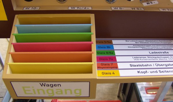 Fertigt man nun noch Frachtzettel mit farbig hinterlegter Ladestelle (Abb. 3), ist die Zuordnung kinderleicht. Natürlich sollte dann auch die Wagenkartenablage ausreichend dimensioniert und farbig gestalten sein, wie wir es heute schon im Bahnhof Weißenberg von Frank Nevoigt vorfinden (Abb. 4). Zugegeben, hier gibt es auch im Bahnhof Hammerunterwiesenthal noch etwas Nachholbedarf. Denn hier ist die Wagenkartenablage nicht nur unübersichtlich, sondern auch viel zu klein.