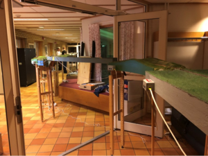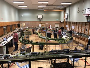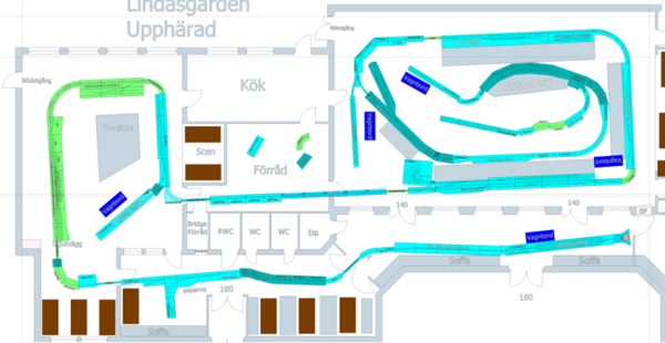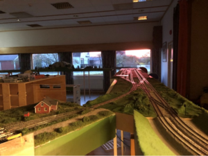 In a Swedish module meeting, there are not only FREMO modules, but also many modules built according the Swedish MMM-standard. Add to that a 375 m2 community centre with two small halls, and corridors and you have a layout planners’ nightmare. It was some tough decisions to break the FREMO norm in several places in order to squeeze the layout into the Building.