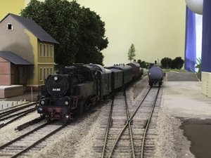 In Thüringen fand ein kleines Treffen der H0fine-Gruppe statt, die sich auch mit verstaatlichten Privatbahnen in der DDR beschäftigt. Es gab einen abwechslungsreichen Bahnbetrieb in kleiner Runde auf hohem Niveau. Im Zentrum des Arrangements stand der Bahnhof Schöningen Süd, der um einen „Wagenspeicher“ ergänzt worden war, auf dem die Güterwagen aufgestellt und abgeräumt wurden. Die eigentliche Zugbildung fand ausschließlich im Rangierbetrieb im Bahnhof statt. Dies war eine interessante neue Erfahrung.