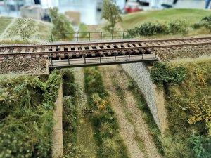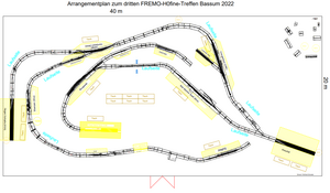 Im Rahmen des vierten norddeutschen H0fine-Treffens, das in der Zeit vom 26.05. - 29.05.2022 nach der zweijährigen Zwangspause in der den 25 angemeldeten Teilnehmern bekannten Sporthalle im Sportzentrum in Bassum stattfand, standen zur Umsetzung eines H0fine-Arrangements einer Hauptbahn mit abzweigender Neben-/ Kleinbahn ca. 800 m2 zur Verfügung.