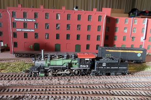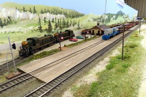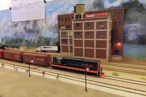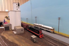 Rangierfreunde hatten nicht nur mit den Betriebsstellen im Bahnhofsbereich, sondern auch mit dem Betrieb im Sweetwater Streetrunning viel zu tun. Von Sweetwater ging es weiter in die zweite Branchline durch Andrew Siding in das angedockte kurze 6-gleisige Mountain Yard. Mehr Strecke war leider nicht möglich, da der Saal „nur“ 9 mal 19 Meter groß ist. Immerhin hatte der Layoutplaner Thomas, der zum ersten Mal auch den Fahrplan und die Jobkarten schrieb, eine Mainline mit 80 m Länge und zwei Branchlines mit 10 m und 12 m in den Saal geflochten. Die Segmentgruppen Monte Vista, Magnolia, Golden, Sweetwater, Mountain Yard sowie die Strecke zwischen Dalton und Flats hatte Hintergründe, was den visuellen Eindruck des Gesamtlayouts weiter aufwertete.