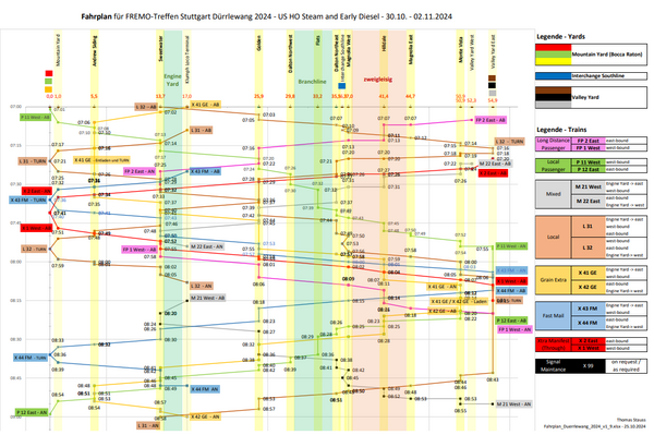 Während des Treffens wurden fünf Sessions gefahren. Dabei variierte die Sessiondauer zwischen 2 und 3 Stunden. Im Laufe des Treffens lief der Verkehr immer besser. In der übrigen Zeit waren freies Fahren und Fotozüge angesagt, oder es fanden die FREMO-üblichen bereichernden Fachgespräche statt. Die Betriebsstellenbesitzer waren in den Pausen zwischen den Sessions immer eifrig dabei, Wendefrachtkarten zu drehen, neue Frachten anzufordern und die beiden neu ausgehenden Locals und den Mixed neu aufzustellen.