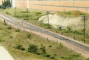An der Strecke stehen Telegrafenmasten: ab ca.15 cm vom Modulkopf beginnend, Abstand der Masten untereinander jeweils ca. 30-35 cm, optisch gemittelt. Die Masten sollten möglichst über drei Quertraversen verfügen, die Isolatoren sollten weiß oder grün bemalt sein. ( Empfehlung: Atlas oder Rix)